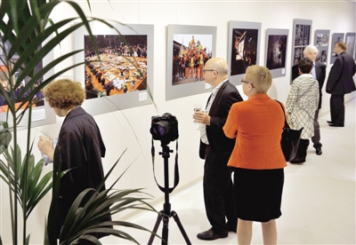 5月6日,观众在法国巴黎观看“中国徽文化”图片展。当日,“中国徽文化”图片展亮相巴黎新华影廊。在一个月时间里,该展览将通过50幅精美摄影作品向观众展现安徽民居、徽州古城生活、徽商文化以及安徽经济发展等方面的内容。 新华社发