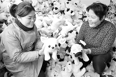 江苏省东海县农业资源综合开发项目区的布玩具生产基地,成为农村剩余劳动力就业平台。图为工人正在检查出口的布玩具工艺品。 张 玲摄