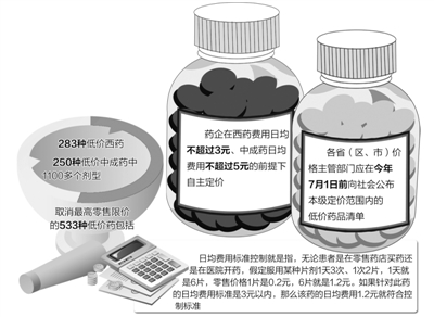 根据今年4月出台的《关于做好常用低价药品供应保障工作的意见》,国家发展改革委决定改进低价药品价格管理方式,对现行政府指导价范围内的低价药品,取消政府制定的最高零售价格,改为在日均费用标准内,由生产经营者根据药品生产成本和市场供求及竞争状况制定具体购销价格。