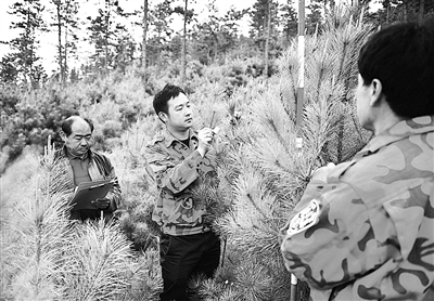 在河北省平泉县柳溪乡七家社区窑沟前山,林业局工作人员为采挖入圃的油松小苗挂条形码牌。
