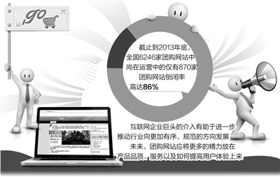 中国电子商务研究中心日前发布统计数据显示,截止到2013年底,全国共诞生团购网站6246家,目前尚在运营中的有870家。团购网站关闭数量累计达5376家,倒闭率高达86%。经过“千团大战”生存下来的网站,像糯米、大众点评、美团等,无一不是在百度、腾讯、阿里巴巴等“干爹”的支撑下“死磕”。