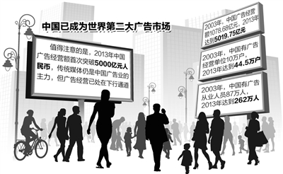 2003年,中国广告经营额1078.68亿元,2013年达到5019.75亿元;2003年,中国有广告经营单位10万户,2013年达到44.5万户;2003年,中国有广告从业人员87万人,2013年达到262万人。“中国已经发展成为世界第二大广告市场。”甘霖说。