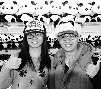 两名年轻人在台北动物园大熊猫馆内的纪念品店展示刚买的“圆仔”帽(3月6日摄)。截至今年4月17日,熊猫宝宝“圆仔”卖出了420项营利性授权产品,已经创造了超过5亿元新台币的产值。