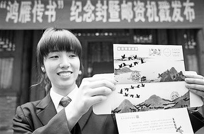 5月10日,一名邮政工作人员在北京前门的飞鱼邮驿展示加盖了邮资机戳的《鸿雁传书》纪念封。
