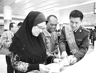 日前,浙江杭州边检站开通24小时服务,为出入境旅客提供高效、安全、和谐的通关服务。图为检查员在指导外籍旅客填写入关单。 范加龙摄