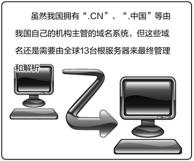 中国互联网络信息中心副总工程师金键在接受媒体采访时表示,目前全世界所有的网络信息,基本都要传送到美国的根服务器上才能返回各国。一旦发生战争或者天灾,完全可能出现整个国家的网络被中断的情况。据了解,虽然我国拥有“.CN”、“.中国”等由我国自己的机构主管的域名系统,但这些域名还是需要由全球13台根服务器来最终管理和解析。