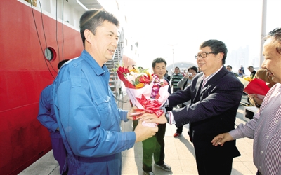 5月12日,我国最先进海洋科学考察船“科学”号完成首航顺利返回青岛奥帆基地码头,人们用鲜花迎接科考人员凯旋。