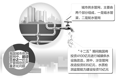 不难看出,资金不足是供水管网工作一大难点。2012年,住房和城乡建设部会同国家发展改革委组织编制了《全国城镇供水设施改造与建设“十二五”规划及2020年远景目标》。根据该规划,“十二五”期间我国将投资4100亿元进行城镇供水设施改造。其中,涉及管网改造投资835亿元,水质检测监管能力建设投资15亿元。该任务明确要求降低供水管网漏损,提出80%设市城市和60%县城供水管网的漏损率需达到国家相关标准要求,地级以上城市建设和完善供水管网数字化管理平台。
