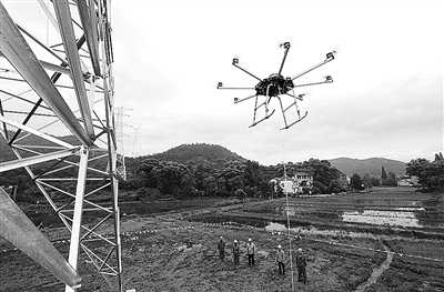 图为多旋翼无人机带着牵引拉线升空。近日,在浙江诸暨凤仪到枫桥的220千伏电力线路施工中,国网绍兴供电公司使用多旋翼飞机进行放线。这是浙江首次使用多旋翼飞机开展架设高压线路作业。 新华社记者 韩传号摄