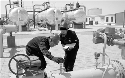 技术人员在青海油田英东采油厂接转站巡检设备(5月12日摄)。据中国石油青海油田公司负责人介绍,位于柴达木盆地的青海油田力争在2017年建成高原千万吨级大型油气田。青海油田是世界海拔最高的油田,平均海拔3000米左右,空气中的含氧量仅为内地的70%。