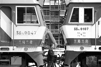 5月13日,在兰州火车站,一名工作人员从停靠的火车头旁走过。为满足兰新铁路第二双线开通后兰州枢纽具备开行动车的能力,兰州车站当日启动对既有设施的全面改造。新建的兰州火车站高铁站台长525米、宽11.5米、高1.25米,旅客可以从站台直接平步进入车厢。