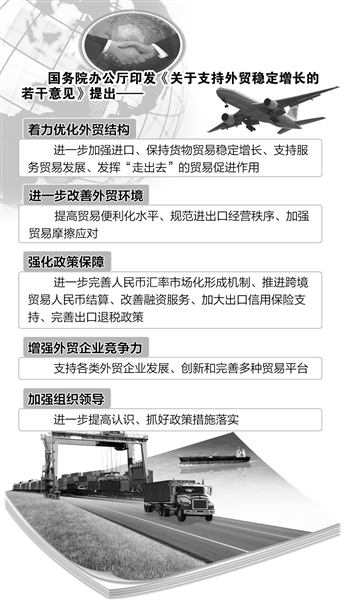 进一步完善人民币汇率市场化形成机制、推进跨境贸易人民币结算、改善融资服务、加大出口信用保险支持、完善出口退税政策……国务院办公厅印发的《关于支持外贸稳定增长的若干意见》构建起了支持外贸稳定增长的政策保障体系。