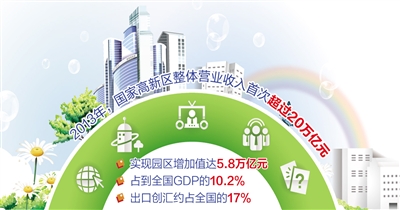 高新区是经济体制改革的先行区,是建设创新型国家的示范区。在提高综合国力、经济结构、产业水平和高新技术企业的竞争力,以及优化创新环境等方面发挥了重要作用。科技部火炬中心常务副主任张志宏表示,高新区对我国经济发展的贡献逐年提高。2013年,国家高新区整体营业收入首次超过20万亿元,实现园区增加值达5.8万亿元,占到全国GDP的10.2%,出口创汇约占全国的17%。相当多的高新区都是当地经济最主要的支柱和最重要的增长点。目前,高新区也成为我国区域创新体系的核心载体。2013年高新区企业研发经费支出达2700多亿元,约占全国的三分之一;全部研发投入占生产总值的比重达5.26%,是全国平均水平的2.7倍;每万名从业人员拥有发明专利是全国平均水平的9.4倍;新产品销售收入占全国企业新产品销售收入的39%。可以说,各地的高新区已经成为靓丽的城市名片,是改革力度大,创新区域优的区域,建立了有利于激活创新要素的新机制、新模式。