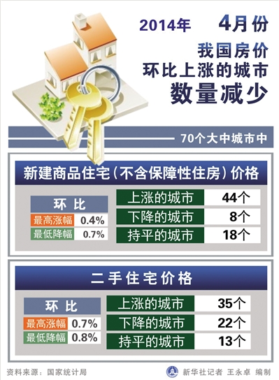 本报北京5月18日讯 记者亢舒报道:国家统计局18日公布了4月份70个大中城市住宅销售价格变动情况。数据显示,4月份,70个大中城市中,新建商品住宅(不含保障性住房)与上月相比,价格上涨的城市有44个,比上月减少了12个。
