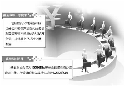 据统计,截至今年一季度末,包括信托公司资管产品、证券公司资管产品在内的各类私募管理资产规模达22.38万亿元,从规模上已超过公募基金。截至5月15日,基金业协会已为1559家私募基金管理机构办理登记手续,所管理的资金规模也达到1.23万亿元。