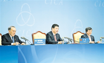 新华社上海5月21日电 (记者耿学鹏 李志晖) 亚洲相互协作与信任措施会议第四次峰会21日在上海世博中心闭幕,亚信主席国中国国家主席习近平和亚信倡议国哈萨克斯坦总统纳扎尔巴耶夫,亚信上届主席国土耳其总统特别代表、外长达武特奥卢共同会见记者。