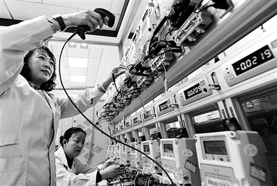 5月21日,黑龙江佳木斯供电公司计量检验检测中心工作人员正在校验智能电表,满足当地新建住宅小区用电需求。一年来该班组共完成8万多块电能表的检定工作,并积极讲解新型智能电表的使用方法,受到广大用户的好评。 本报记者 赵 晶摄