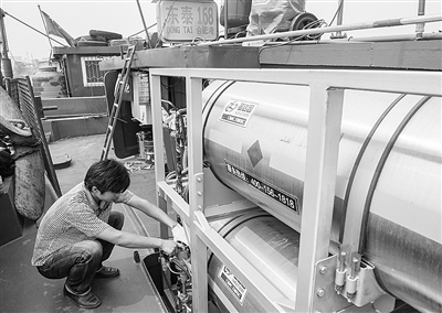 5月21日,东泰168船船主在合肥东港码头查看船上的天然气罐。当日,安徽合肥首艘“油改气”船舶交付船东使用。“油改气”项目的实施,将减轻船舶对所经流域生态环境的破坏。 新华社记者 杜 宇摄