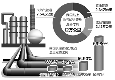 “‘11·22’事故以后,我们对全国的油气管线开展了拉网式的专项督查。”杨栋梁介绍说。从2014年2月下旬至4月上旬,国务院安委会再次组织16个督查组,对全国31个省(区、市)和新疆生产建设兵团安全生产重点工作进行了专项督查。据排查统计,我国陆上油气输送管线总长度约12万公里,其中,原油管道2.34万公里,成品油管道2.12万公里,天然气管道7.54万公里;9家中央企业所属管道10.36万公里,地方企业所属管道1.64万公里。运行10年以内、10至20年、20至30年和30年以上的长输管道分别占总里程的69.80%、16.90%、6.45%和6.85%。