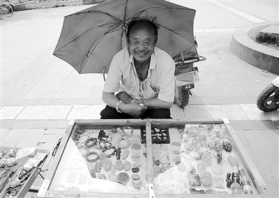 伞是温度。它当然也能挡住阳光的过高温度。江苏沛县的街边,一位中年男人把自己搜罗来的玉石钱币摆在烈日下,向来人展示着自己的热情。一把用旧的伞,给摊位投下一小片阴翳,但已足以护住他的笑容。 寸 心摄