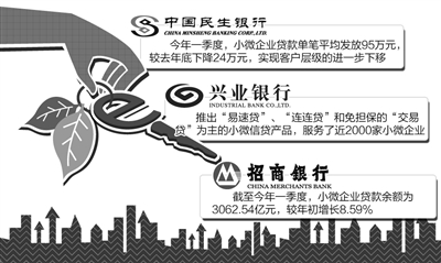 数据显示,今年一季度,民生银行累计发放小微贷款981亿元,发放笔数超过10万笔,小微贷款单笔平均发放额95万元,较去年底水平下降24万元,实现了客户层级进一步下移。此外,兴业银行“易速贷”、“连连贷”和免担保的“交易贷”为主的小微信贷“三剑客”推出不到3个月,累计落地金额已近60亿元,为近2000家小微企业提供了服务;招行一季报数据显示,其小微企业贷款余额为3062.54亿元,较年初增长8.59%。