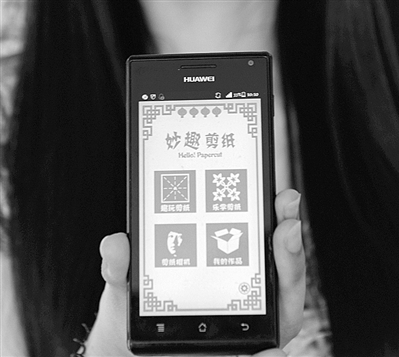 西安电子科技大学“妙趣剪纸”项目组负责人王琳和她的小伙伴们开发了一款剪纸的手机应用程序,让用户通过手机体验剪纸的乐趣。图为王琳展示手机应用程序。 新华社记者 李一博摄