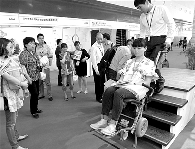 5月26日,一名观众在展会现场体验“自动爬楼机”。当日,第九届中国国际养老及康复医疗博览会在上海世博展览馆开幕。来自德国、日本等15个国家和地区的300多家企业携数千种高新科技产品集中亮相。 新华社记者 丁 汀摄