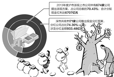 在股票市场相对低迷的背景下,上市公司提高现金分红对增强A股市场活跃度意义重大。上海证券交易所最新发布的《沪市上市公司2013年度现金分红专题分析报告》显示,2013年度沪市派现上市公司总数和累积派现金额都创造历史新高。其中,共有674家公司提出派现方案,占公司总数的70.43%,同比上涨3.22%;合计分配现金红利达6707亿元,较2012年增长748亿元。深市方面,根据深交所发布的《深交所多层次资本市场上市公司2013年报实证分析报告》,2013年深市共有1171家公司推出现金分红预案,较2012年增加16家,分红公司占比74.30%,较上年增加1.02个百分点;涉及分红金额933.48亿元,同比增加2.23%;剔除亏损公司,有233家公司股利支付率超过50%;885家公司连续3年以上分红。
