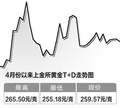 近期,国际现货黄金价格围绕1300美元/盎司整数关口展开激烈争夺,连续五周在1276美元/盎司至1310美元/盎司箱体内运行,仍没有明确方向性线索。截至5月26日16时12分,国际现货黄金价格交投于1291.51美元/盎司左右,下跌0.08%。而上海黄金交易所数据显示,AU(T+D)报收于259.57元/克,比上一交易日下跌0.33元,跌幅达0.13%。齐鲁商品交易中心总裁李珩迪表示,近期如果没有基本面消息影响,黄金依旧维持震荡走弱的态势成为大概率事件。