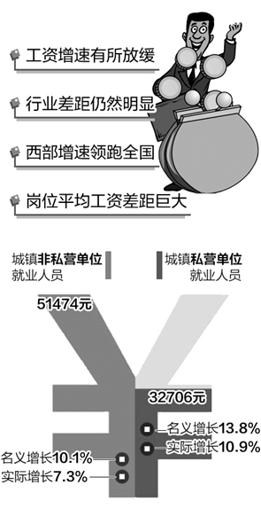 国家统计局人口和就业统计司司长冯乃林介绍说,经济运行总体保持平稳较快增长,为工资水平稳定增长奠定了基础。扣除物价因素,城镇非私营单位工资水平实际增长7.3%,城镇私营单位工资水平实际增长10.9%。尽管全国就业人员工资水平继续保持较快增长,但增速有所放缓。
