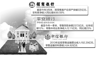 日前,浦发银行宣布将与中国移动开展合作,借助对方账户优势推出10086专属理财产品以及贷款、支付等综合产品,发力零售银行业务。而不久前,平安银行、中信银行也均在零售银行业务上开足马力,构建大零售事业部制。一直以零售业务见长、被业界称为零售银行“七匹狼”狼头的招商银行在2014年一季报中披露,截至3月末,其零售客户总资产突破3万亿元,非利息净收入同比增长90.59%。招商银行相关负责人对本报记者表示,接下来招行还将构建轻型银行,继续做强零售业务。