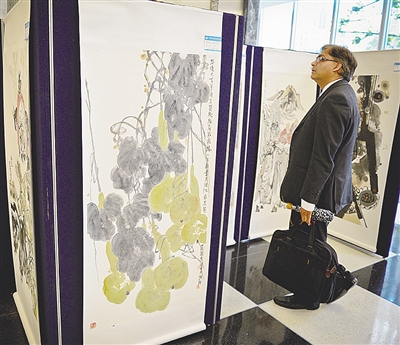 由中国常驻联合国代表团及山东省文联等主办的“中国书画名家精品展”日前在联合国总部开幕,数十幅中国传统书画作品在此展出。图为参观者在纽约联合国总部观看在此展出的中国书画作品。