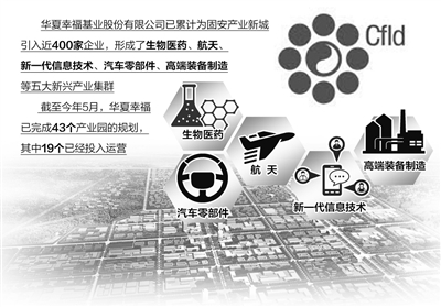 上述重大项目的“落地”,均与华夏幸福基业股份有限公司有关——这家上市企业已累计为固安产业新城引入近400家企业,形成了生物医药、航天、新一代信息技术、汽车零部件、高端装备制造等五大新兴产业集群。