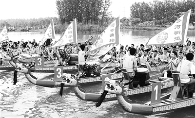| 6月2日,山东滨州经济技术开发区秦皇河上锣鼓喧天,热闹非凡,来自社会各界的14支代表队举行龙舟比赛。 |