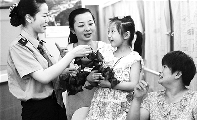 | 6月1日,在北京西站开往福建龙岩的K571列车上,列车员周雨婷(左一)为乘客送来了粽子。 |