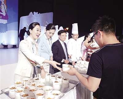 图为日前在北京举办的2014韩国旅游文化节期间,大韩航空公司工作人员向现场观众讲解韩式拌饭和牛肉盖饭的制作方法。 本报记者 陈 颐摄