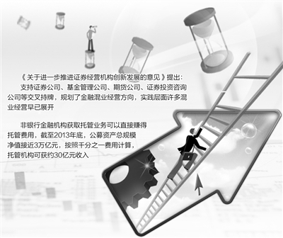 非银行金融机构获取托管业务一方面可以直接赚得托管费用,截至2013年底,公募资产总规模净值接近3万亿元,按照千分之一费用计算,托管机构可获约30亿元收入。更大的布局在于获取托管业务后,券商可借机打通托管清算、融资融券、销售推广的产业链,提高综合服务能力。