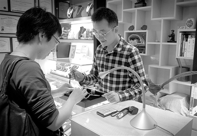 2010年毕业的黄怡圣(右)取得国际珠宝注册鉴定师资质后,辞去工作来静安青年创业实践孵化园接受创业实践见习孵化。在孵化园老师的指导和见习单位帮助下,他先后开办网店和实体店,用诚信经营吸引了许多客户来买放心珠宝。图为他正在为客户鉴定珠宝。