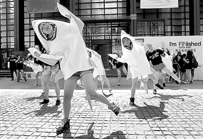 日前,“我与鱼翅说再见”护鲨活动在上海举行,一群身着“鲨鱼服”的志愿者走上街头呼吁人们拒食鱼翅、保护鲨鱼,为野生动物保护和维护海洋生态环境贡献力量。 新华社记者 裴 鑫摄
