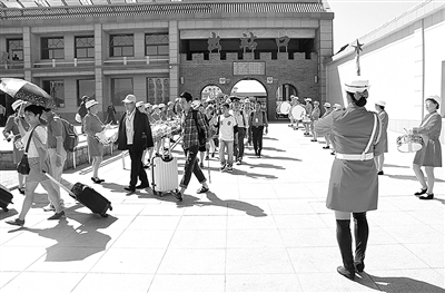地处长城脚下的沈阳铁路山海关站,抓住旅游旺季,以温馨的服务为游客提供良好的出行环境,受到游客称赞。图为山海关站与秦皇岛联众旅行社组织军鼓队在出站口迎接游客。本报记者 孙潜彤 通讯员 呼兴宝摄影报道