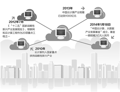 2010年,我国政府把云计算列入国家重点扶持的战略性新兴产业。随后,工信部和发改委联合发布《关于做好云计算服务创新发展试点示范工作通知》,确定在5个城市先行开展云计算服务创新发展试点工作。2012年7月,《“十二五”国家战略性新兴产业发展规划》又将物联网和云计算工程作为20项重点工程之一。