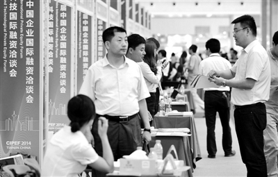 6月6日,第八届中国企业国际融资洽谈会——科技国际融资洽谈会在天津市梅江会展中心开幕。图为一名与会人员(右一)向参展单位的工作人员咨询。 新华社记者 岳月伟摄