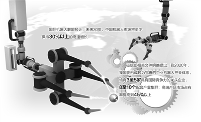 国际机器人联盟预计,2014年,中国工业机器人年装机量将超过日本,达到3.2万台,占到世界总量的20%,将成为全球最大的机器人市场。在巨大需求的拉动下,未来30年,中国机器人市场将至少保持30%以上的高速增长。