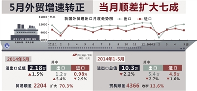 海关总署8日发布的数据显示,5月份,我国进出口总值2.18万亿元,外贸增速由前4个月的下降3.1%转为增长1.5%。其中,出口1.2万亿元,由前4个月的下降4.8%转为增长5.4%;进口0.98万亿元,下降2.9%;贸易顺差2204亿元,扩大70.3%。