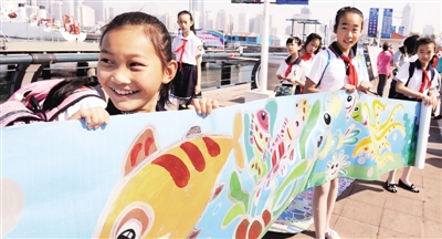 6月8日,几名小学生在青岛奥帆中心展示百米海洋画卷局部。当日,青岛举行“关爱海洋 我们一起行动”2014世界海洋日暨全国海洋宣传日活动,呼吁全社会一起行动,认识海洋、关爱海洋。 新华社记者 李紫恒摄