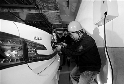 6月3日,萧山区供电公司工作人员在为李先生的电动汽车检测充电设备的可靠性。当日,在经历了一个多月的申请、手续准备和等待后,杭州市萧山区的李先生为他的电动汽车成功上牌“落户”。这是杭州限牌令实施以来萧山区首辆无需摇号、竞拍就直接成功上牌的插电式电动汽车,也是该区第一辆配置了家用充电设施的电动汽车。