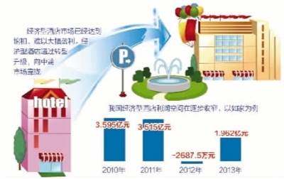 近年来,我国经济型酒店快速发展。在激烈的市场竞争中,不少经济型酒店的利润空间也在逐步收窄。数据显示,2010年至2013年,如家的净利润分别为3.595亿元、3.515亿元、亏损2687.5万元、1.962亿元。