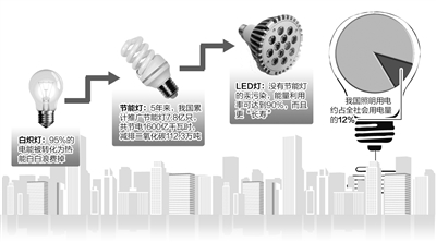 如今节能灯(又称紧凑型荧光灯)占据照明市场半壁江山,传统的白炽灯已难觅踪影。白炽灯的“光荣退休”旨在节能减排。统计数据显示,世界各国的社会照明用电约占该国全社会用电量的10%至20%,我国的照明用电约占全社会用电量的12%。
