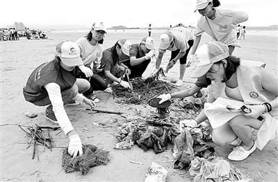 日前,来自福建各地的数百名环保志愿者来到福建平潭岛龙凤头海滩,开展以“碧海银滩生态行”为主题的清洁海滩行动。 新华社记者 张国俊摄
