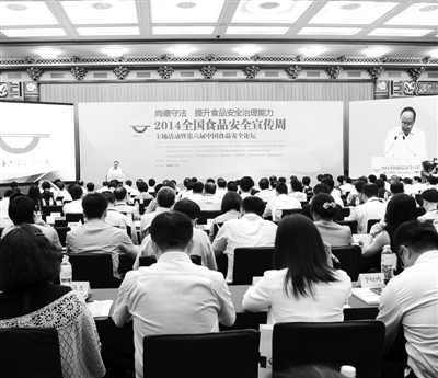 上图 6月10日,由国务院食品安全办、中央文明办、教育部、工信部等17部门主办,中国经济网执行承办的2014年全国食品安全宣传周主场活动暨第六届中国食品安全论坛在北京举行。图为论坛现场。